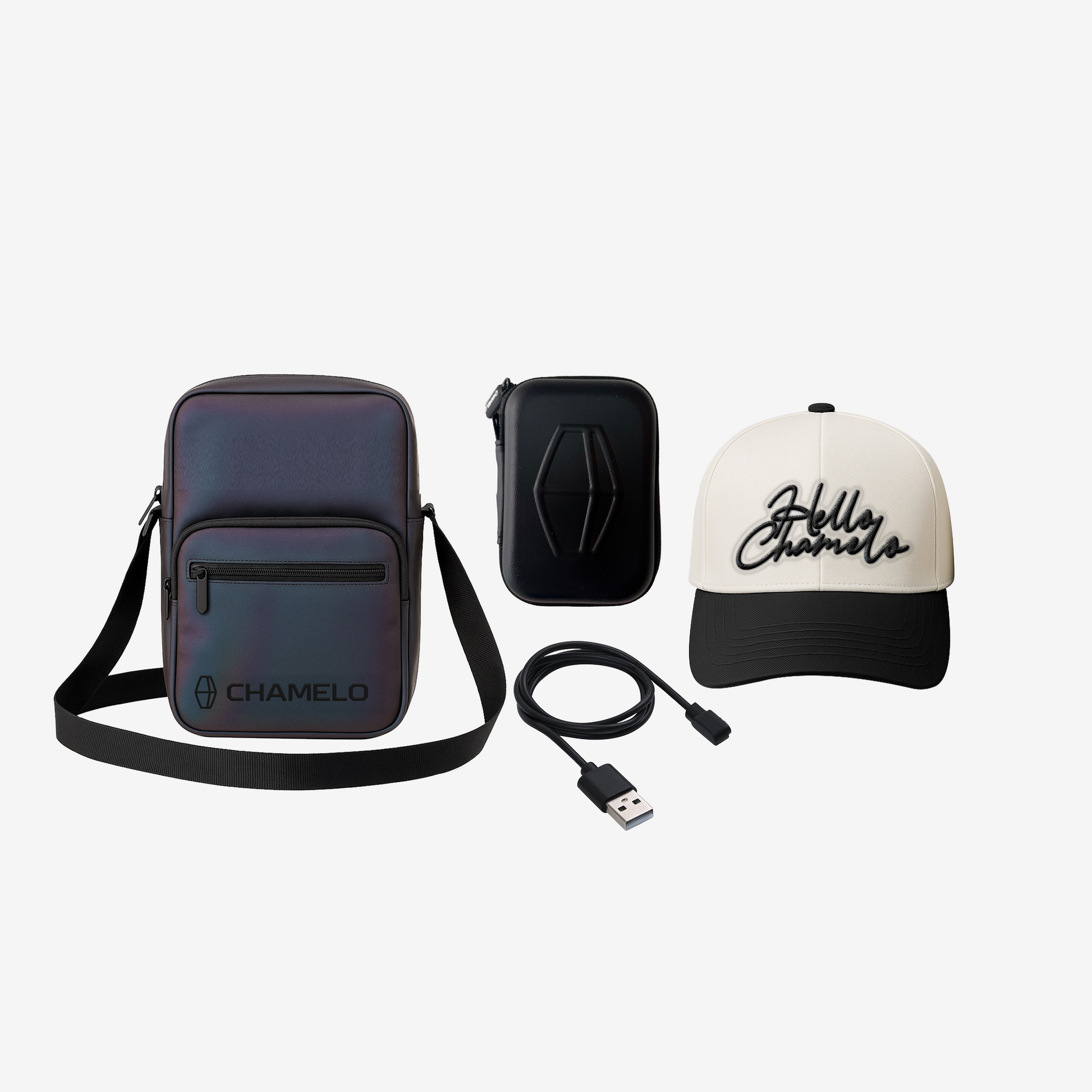 Elevate your essentials with the Aura Bundle—featuring a go bag, colorful Hello Chamelo hat, cleaning kit, and charging cable.
